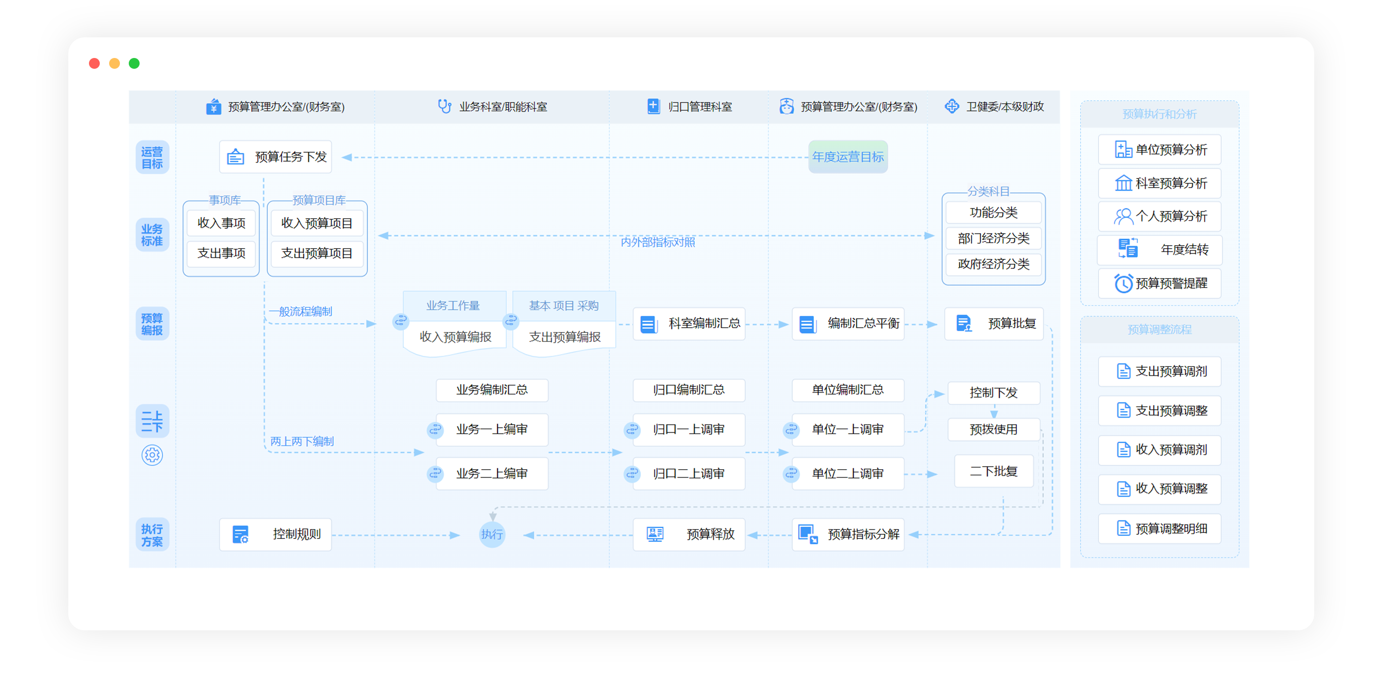 为医院构建统一预算管理平台,覆盖单位预算编制、批复、分解、释放、控制、调整、结转及分析全生命周期,推动预算管理轻松高效、准确执行。 应用场景:预算编制|预算批复|科室分解|预算释放|预算控制|预算调整|预算调剂|预算结转|单位预算分析