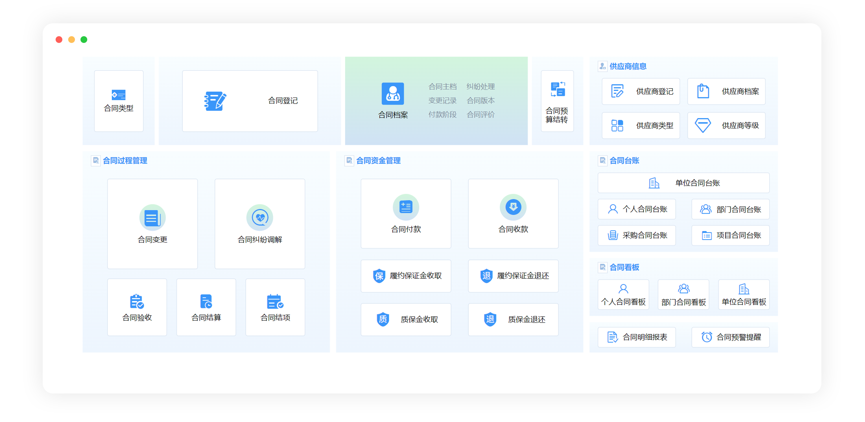全流程数智化管控合同会签、收付款、变更、结算、结项、档案、台账,实现合同全生命周期管理,推动合同管理合规、有效。 应用场景:合同会签|合同收付款|合同变更|合同结算|合同结项|合同档案|合同台账|合同看板