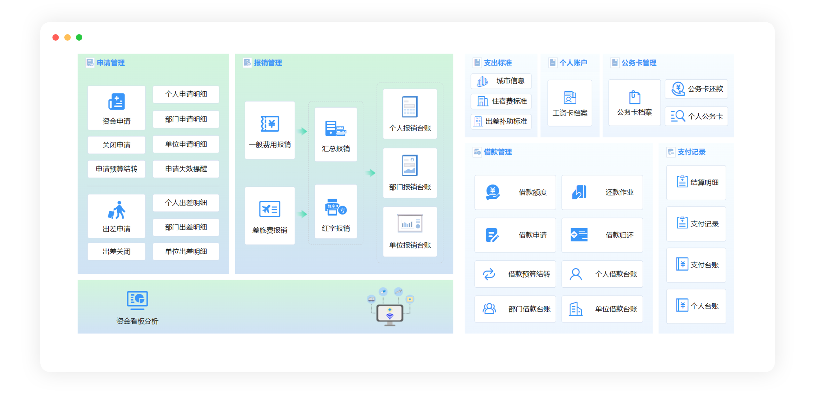收支管理是单位日常业务的主要管理模块,用于管理单位资金收入,对单位费用开支进行实时动态监管,实现支出管理的事前预算控制、事中财务核算、事后报表分析。 应用场景:经费到账登记|其他资金收入|城市信息|支出标准|档案管理|资金申请|费用报销|出差申请|差旅费报销|报销台账|结算明细