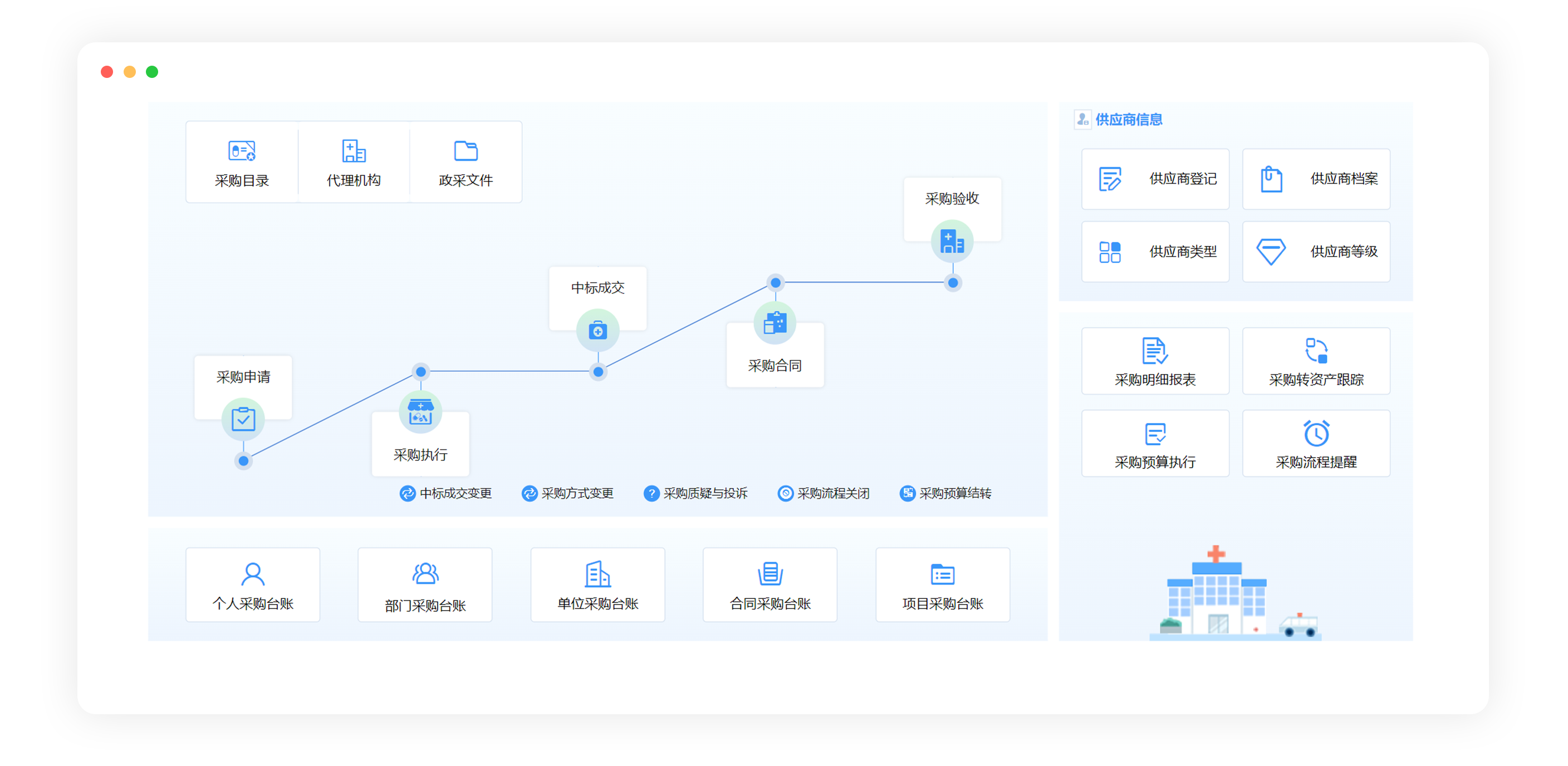 围绕采购需求-计划-执行-验收全过程线上化管理,统一管理供应商,全程监控采购合同履约情况,有效避免采购违规行为,降低采购风险。 应用场景:供应商档案|采购目录|代理机构|采购申请|采购执行|采购方式变更|中标管理|采购合同|采购验收|采购明细报表|采购台账